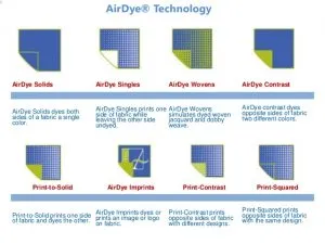 Fabrics dyed with AirDye technology supposedly feel no different than conventionally dyed textiles. They can be dyed all one color, a different color on each side, a pattern on one side and a solid color on the other, or a pattern on both sides as follows. Dye-to-Dye Contrast: AirDye technology that dyes two different colors on opposite sides of a piece of fabric without the use of water. Dye-to-Print: AirDye technology that, on a single piece of fabric, dyes one side a solid color and one side a print, without the use of water. Dye-Squared: AirDye technology that dyes the same solid color of ink on both sides of a piece of fabric, without the use of water. Print-to-Print: AirDye technology that dyes one side of a piece of fabric with a print and the opposite side of the fabric with another print, without the use of water. KEY FEATURES OF AIR-DYE TECHNOLOGY