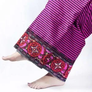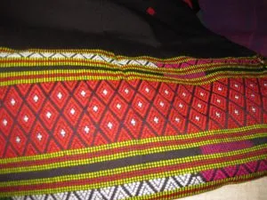 The piece is woven either in a single dark shade or with stripes in three different colours on a light background. The border on the side is however left a plain black band, on which a pattern is first drawn, then worked with untwisted silken thread. It is in a dark but matching shade usually red, chocolate or plum. The stitching is so finely chiselled and even, that it seems part of the weave itself. In fact as this is the only ornamentation on the phaneyk, to a stranger unaware that it is a later addition, it would seem like a delicate woven decoration.