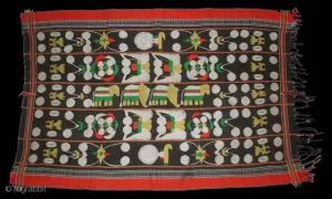 The well-known gorgeous black shawl, popularly called the Angami Naga shawl but whose real name is sami lami phee, the literal meaning being the wild animals warrior cloth depicts mainly animals. One time it used to be bestowed on distinguished warriors by the rulers for their success in hunt and warfare and was therefore highly coveted. The background is always black, divided into horizontal panels by woven bands of colours. Embroidered within these panels are a whole array of animals like elephants, butterflies, sheep, etc.