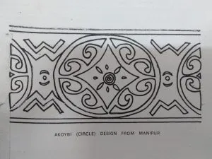 An elaborate design called Akoybi, circular, as the overall pattern is circular, one circle joining the other, with each circle being further broken into patterns, each with a significant motif with a special name. There is a romantic tale tracing it back to the legendary snake Pakhamba, who was killed by the husband of the goddess and who later remorse tried to atone for it by copying its scaly patterns to perpetuate them in the form of a textile design. There is another interpretation, less romantic but more imaginative, to make it out as inspired by the circular swirls of the water. The central motif is a dot for a bee hovering over lotus buds. Four petals are seen on the side of the dot. Some half open circular designs make a pattern indicating the fishing hook design. This brief description however barely gives an idea of the real complexity of the Akoybi.