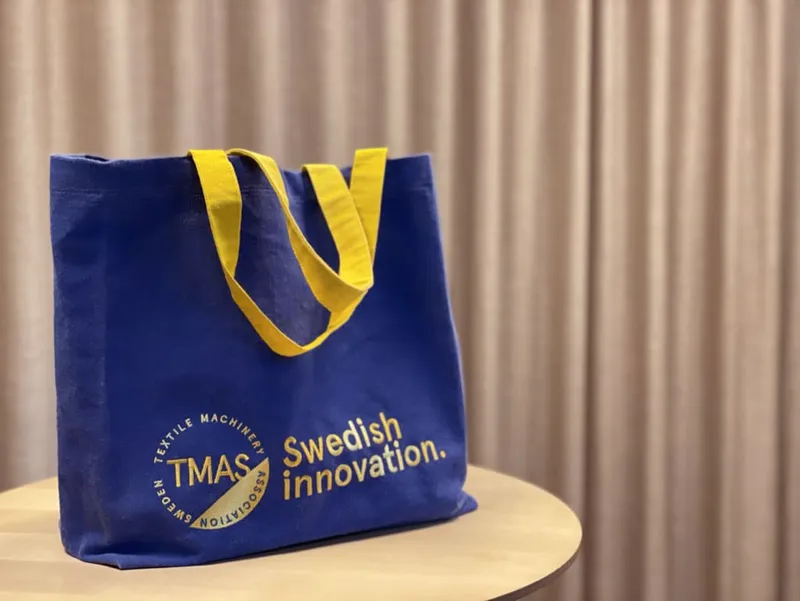 Fully automatic TMAS member Automatex has developed a fully automatic tote/consumer bag sewing unit which can produce fully finished bags in heights of between 35-80cm and widths of 30-80cm. The machine is configured to carry out all the necessary automated operations including hemming, handle insertion, cutting, labelling, bag forming and gusset forming, which previously had to be carried out manually. Its output is some 540 units an hour, introducing a completely new cost paradigm. The resulting bags, however, are still plain and uniform at this point, and with products that are intended to be used for as long as possible, personalisation is the key. Unique designs work to ensure purchasers are likely to become more attached to their products – and are happy to pay a little more for them in the first place. Instant colouration In order to add decorative appeal, another TMAS member company, Coloreel, became involved in the project. Coloreel continues to secure multiple orders for its instant thread dyeing technology for high-speed decoration and embroidery – notably with the fast-rising new generation of online merchandisers and brands for whom mass customisation and produce-on-demand sales are the key. The addition of a distinctive embroidered design to the tote bag using Coloreel’s technology took the product to a new level of attractiveness, as a further showcase for Swedish innovation. The technology enables the high-quality and instant dyeing of a textile thread while it is actually being used in embroidery production. It can be used with any existing embroidery machine without modifications. Additionally, this technology makes it possible to produce gradients in an embroidery design, as demonstrated by the TMAS logo and the text in the image. Advanced rapid colour formulation software and high-speed drive technology allow a single needle to carry out what it previously required many multiples of them to do – and with much more consistent stitch quality. By instantly dyeing a recycled white thread during production, the system enables complete freedom to create unique decorations and embroideries without any limitations. Colour changes along the thread can either be made rapidly from one solid colour to another, or gradually, to make smooth transitions or any colouring effect desired. This provides big benefits when it comes to both sustainability and design creativity. Potential of Swedish innovation “Coloreel’s designs on the batch of bags produced on the Automatex machine are truly outstanding and have been turning heads wherever they appear,” says TMAS secretary general Therese Premler-Andersson. “The collaboration really emphasizes the positive potential of the latest Swedish digital textile technologies which are enabling companies to generate new revenue streams wherever they happen to be located.”