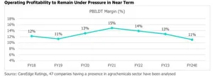 The operating profitability margin for agrochemical companies remained healthy at 14% to 15% in FY21 & FY22. It, however, moderated to 13% in FY23 due to impact of the decline in input prices leading to inventory losses, especially in H2FY23. Going ahead, in line with the likely moderation in sales growth in FY24, operating profitability is also expected to remain under pressure in the near term.