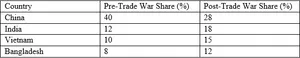 Interpretation: Figure 1 indicates the U.S.-China trade war reduced China’s share of U.S. apparel imports from 40% to 28%, benefiting India (12% to 18%), Vietnam (10% to 15%), and Bangladesh (8% to 12%). This shift reflects brands diversifying supply chains to reduce reliance on China due to rising tariffs and geopolitical risks, favoring alternative manufacturing hubs.