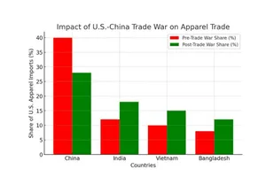 The ongoing US-China trade war has considerably impacted global apparel trade. Tariff impositions have shifted sourcing patterns, benefiting alternative production hubs like India, Vietnam, and Bangladesh.