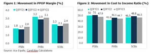 - PPOP margin of SCBs rose by 30 bps y-o-y to 2.4% in Q3FY23 driven by PSBs. PSBs PPOP margin expanded by 33 bps to 98% in Q3FY23, meanwhile PVBs expanded by 20 bps to 3.1% in the quarter.