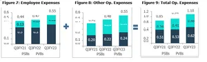 - PSBs employee expenses rose by 4% due to wage revision (provision created) whereas PVBs employee expenses rose by 17.5% due to the addition of employees & branches in the quarter.