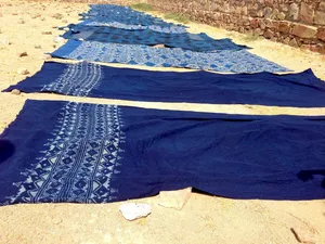 Block Printing in Gujarat In Gujarat, this form of hand Printing has been practiced and perpetuated by the Paithapur families. They make intricate blocks, and print their textiles using the mud resist-Printing method. These prints are called Sodagiri (trader) prints. In Kutch, the popular patterns are black and red designs of birds, animals, and dancing girls. The saris of Ahmedabad and Baroda have large mango patterns against a red or blue background.The other well known centers for block Printing in Gujarat are Bhavnagar, Vasna, Rajkot, Jamnagar, Jetpur and Porbandar. Dhamadka a village in Gujarat has many printers using mostly madder root for printing red color, rusty iron solution for black color and indigo for blue color. These fabrics are known as Ajrakh. The designs made by block printing are geometric.