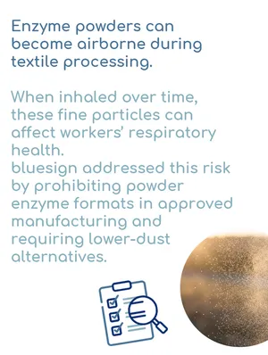 Certification bodies also influence the adoption of lower-risk product formats. More than a decade ago, bluesign identified airborne enzyme dust as an occupational health concern and incorporated this into its system requirements. As a result, powder enzyme products are not permitted in the manufacturing of bluesign® APPROVED materials or bluesign® PRODUCT. This policy is based on upstream risk assessment rather than reliance solely on downstream testing.