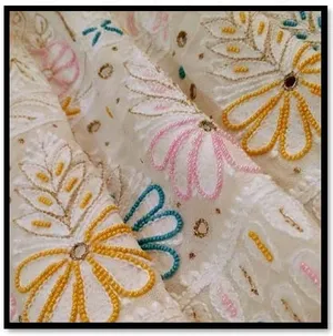 Generally, the color of fabric is lighter than the color of embroidery thread as the embroiderer wishes to highlight their work. Chikankari is mostly done on fabrics like cotton, crepe, chiffon, georgette, silk or any other which is thin and soft.