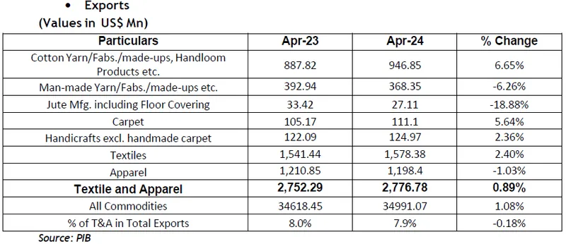 • During Apr’24, Indian Textiles Exports registered a growth of 2.40% over the previous year while Apparel Exports registered a degrowth of 1.03% during the same time period. • Cumulative Exports of Textiles and Apparel during Apr’24 have registered a growth of 0.89% over Apr’23.