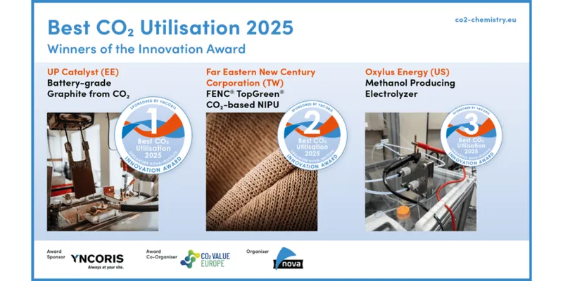 At the 2025 CO₂-based Fuels and Chemicals Conference held in Cologne and online, three companies were honored for exceptional advancements in carbon capture and utilisation (CCU). Out of six finalists, UP Catalyst, Far Eastern New Century Corporation, and Oxylus Energy received top honors in the “Best CO₂ Utilisation 2025” Innovation Award, marking significant progress toward sustainable carbon alternatives.