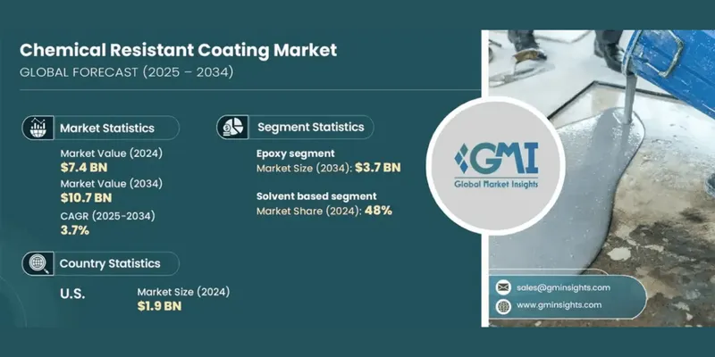 The chemical resistant coating market is valued at USD 7.4 billion in 2024 and is projected to grow at 3.7% CAGR from 2025 to 2034. This market growth is largely driven by industrial expansion and urban development, particularly in emerging economies.