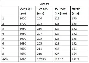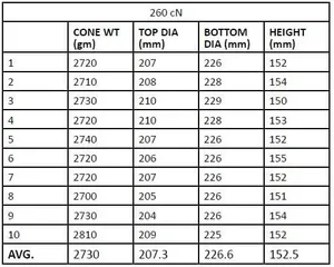 1) By the observing the above tables, we will choose 250 cN& 260 cN tension as it shows better results than 270 cN tension. 2) Now we need to decide which is the best among these two tensions. 4.0 Determine the best result by finding out cone density 1) In autoconer, select 10 drums and set the yarn tension at 260 cN by keeping the speed constant. 2) Feed the empty cones in the respective drums and mark them according to the order. 3) Wait until the doff gets completed. 4) Observe and record the following measurements like weight, top and diameter & height. Also note the top and bottom diameter & weight of empty cone. 5) Do the same as described above for yarn tension 250 cN. 1 Result & Calculation