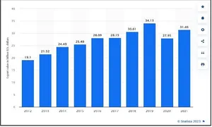 Figure: The export value of ready-made garments (RMG) in Bangladesh from 2012 to 2021, Statista, 2023.