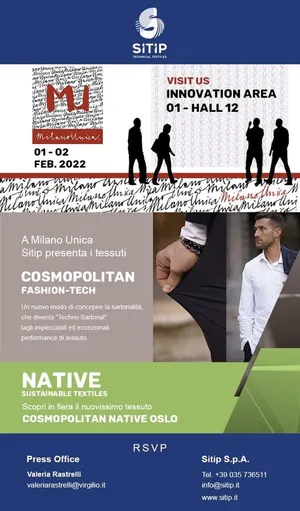 With the COSMOPOLITAN Fashion-tech fabrics collection, Sitip presents man’s suits with high performance, great design, and incomparable fit: bi-stretch, UV 50+ protection, breathability, comfort on the skin, and easy care. For women, the athleisure trend is confirmed with no seethrough and breathable leggings for absolute freedom of movement. Sistema Moda Italia confirms its Innovation Area for the 34th edition of Milano Unica, an area that responds to the growing demand for innovation in products, processes, and services are able to give specific performances or made with innovative and sustainable systems. And right here we find Sitip’s technical fabrics for clothing, with the COSMOPOLITAN Fashion-tech fabrics collection, modern and comfortable, dedicated to contemporary urban wear/sportswear style and which perfectly meets the new needs required by the market and by the final consumer: performance and design. COSMOPOLITAN Fashion-tech is declined into urban wear through the sartorial technical fabrics that the company has defined Techno Sartorial: tailoring that combines flawless cuts with exceptional fabric performance. For the production of contemporary urban wear, thought for the city, Sitip showcases the man’s suit made of jacket+trousers in warp-knit Cosmopolitan Citylife fabric: bi-stretch nylon with UV protection (UPF 50+), quick-drying, easy-care and skin comfort. Highly performing, breathable, comfortable, insulating, and with an exceptional fit: incredible elegance and comfort that enhances the contemporary urban wear style. The white shirt is a warp knitted fabric - Cosmopolitan Milano - bi-stretch, with UV protection (UPF 50+) and quick drying. On the skin, exceptional comfort, freedom of movement, and perfect fit. For women, Sitip presents COSMOPOLITAN Fashiontech fabrics dedicated to athleisure, with leggings made - for the summer version - in Cosmopolitan London, a bi-stretch circular knitted fabric, no seethrough, breathable, comfortable on the skin with UV protection (UPF 50+), with easy care and perfect shape retention, and - for the winter version - in Cosmopolitan Paris GZ, a circular knitted fabric raised on the reverse side, with the same properties as the previous one + thermoregulation characteristics. In addition to jackets and trousers in stretch nylon, which guarantee freedom of movement and high comfort with the Citylife fabric, leggings with characteristics of maximum opacity and comfort with the Paris GZ, London, Cobra 40 Power and Scuba fabrics, the COSMOPOLITAN Fashion-tech fabrics applied to knitwear with a soft, light and breathable hand, with the Instinct fabric, also available in the recycled and raised version NATIVE INSTINCT GZ: a GRS certified thermal fabric made with pre-consumer recycled yarns, bi-stretch, breathable, resistant to pilling, easy-care and high comfort, ideal for sporty knitwear and urban wear part of the NATIVE SUSTAINABLE TEXTILES family, the Sitip fabric collection produced with GRS certified recycled yarns and low environmental impact chemicals with lower consumption of natural resources, able to respect the environmental and social criteria extended to all the stages of the production chain, including the traceability of raw materials. Sitip also operates in line with international certifications such as OEKO-TEX®, BLUESIGN®, GRS and adheres to the ZDHC gateway, adding to these an ISO 14001 environmental management system, which certifies the company’s commitment to reducing pollution risks. Discover also the brand-new COSMOPOLITAN NATIVE OSLO fabric, the new one of the NATIVE SUSTAINABLE TEXTILES family.