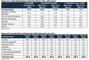 Incremental gross bank credit rose by 1.6% in May 2023, vs. 1.2% over the year-ago period. Generally, the beginning of the fiscal sees marginal growth or drop. The growth was positive and strong for April and also May 2023, which was driven by services and agriculture & allied activities. Personal Loans Segment The personal loan segment (largest segment with a 32.1% share) witnessed a robust growth of 19.2% y-o-y in May 2023 due to strong growth in unsecured loans, vehicle, home and education loans. • Housing loans (share of 47.3% within personal loans) grew by 14.6% y-o-y in May 2023 compared to 13.6% a year ago. Despite reporting healthy growth, the share of housing loans reduced to 47.3% in the personal loans segment as of May 19, 2023, vs. 49.2% over a year ago as unsecured loans grew at a faster pace. • Vehicle loans (share of 12.3% within personal loans) registered a robust growth of 22.2% y-o-y in May 2023 as compared to 14.1% in the year-ago period on account of strong growth in sales volume. According to the Society of Indian Automobile Manufacturers (SIAM), vehicle sales in all segments improved in May 2023 compared to May 2022. Passenger vehicle sales registered a healthy growth of 13.5% y-o-y in May 2023, while Two-Wheelers also posted a growth of 17.4% y-o-y. Domestic sales of Three-Wheelers grew by a robust 70.4% y-o-y, although on a low base. Outstanding credit for vehicle loans stood at Rs 5.1 lakh crore as on May 19, 2023. • Unsecured loans reported a robust growth of 24.0% y-o-y in May 2023 due to the granularisation of credit, digitalisation of loans, and preferences for premium consumer products. Its share increased to 33.0% in the personal loans segment as of May 19, 2023, vs. 31.7% over a year ago. Within unsecured loans, credit card outstanding witnessed a robust rise of 29.9% y-o-y to Rs 2.01 lakh crore in May 2023 driven by wedding season and summer vacations. After housing, unsecured loans is the second biggest component in the personal loan segments. Given the strong demand for different personal loan verticals, we anticipate the growth to remain robust for FY24. • Loans against gold jewellery also witnessed a strong growth of 22.1% y-o-y vs. a drop of 2.2% in May 2022 due to a sharp increase in gold prices in May 2023 vs May 2022. As the price of gold rises, it gives borrowers an additional opportunity to get more credit from the banks with the same quantity of gold. • Education loans saw a rise of 18.3% y-o-y in May 2023, vs. a growth of 6.1% in May 202. This can be partially attributed to the rise in student visas as a higher number of students opted for foreign education and also growth reported in India. Services Segment The services sector registered robust growth of 21.4% y-o-y in May 2023 compared to a growth of 12.7% over a year ago.