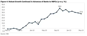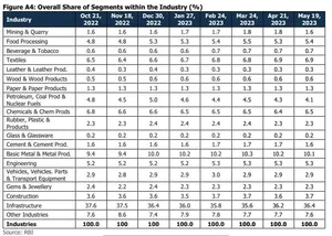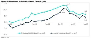• Lending to NBFCs (within services, the share of 36.4%) grew by 27.6% y-o-y in May 2023 from a growth of 17.8% in May 2022. It was continued driven by healthy growth reported by NBFCs for their loan disbursement and a shift of borrowings to the banking system. • The trade segment (share of 22.8% within services) grew 17.5% in May 2023 as compared to 13.2% in the year-ago period due to growth in the retail trade (21.8%). • The growth in services is largely driven by NBFCs, If NBFCs are excluded, the credit growth would have been lower but would have remained robust at 18.1% on a y-o-y basis. • The growth in services was also led by growth in ‘other services’, which grew by 26.6% on of y-o-y basis compared to 13.4% last year. Industry