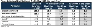 Synopsis • Gross bank credit offtake witnessed a continued rise of 15.4% year-on-year (y-o-y) in May 2023. The growth was driven by services and personal loans as Non-Banking Financial Companies (NBFCs), vehicle loans, unsecured personal loans1 and retail trade reported robust growth. o Services segment jumped 21.4% y-o-y in May 2023 as compared with 12.7% a year-ago due to growth in NBFCs, retail trade and other services. o Personal loans rose by 19.2% y-o-y in May 2023 from 16.3% a year ago, driven by growth in unsecured, housing and vehicle loans loan. o Industry moderated at 6.0% y-o-y in May 2023 from 8.8% over the year-ago period due to moderate growth in MSME and infrastructure. Infrastructure rose marginally by 1.7% y-o-y against 9.8% in May 2023 as credit for power witnessed a slower rate, road moderated, and telecommunication reduced. o Agriculture and allied activities segment also rose by 16.0% y-o-y in May 2023. Summary of Sectoral Performance