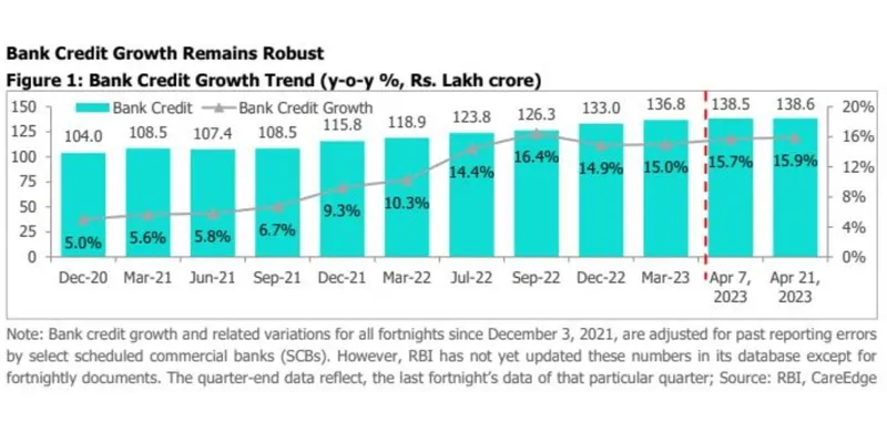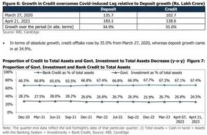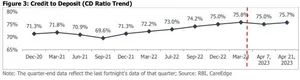 Synopsis • Credit offtake rose by 15.9% year on year (y-o-y) for the fortnight ending April 21, 2023. In absolute terms, credit offtake expanded by Rs.19 lakh crore to Rs.138.6 lakh as of April 21, 2023. The growth has continued to be driven by personal loans, NBFCs, and higher working capital requirements. • Deposit witnessed a slower growth at 10.2% y-o-y compared to credit for the fortnight ended April 21, 2023. The short-term Weighted Average Call Rate (WACR) has reached 6.70% (as of April 28, 2023) from 3.63% as of April 29, 2022, due to a rise in policy rates and lower liquidity in the system. • The Credit to Deposit (CD) Ratio as of April 21, 2023, rose sequentially to 75.7% from 75.0% in the previous fortnight due to incremental credit offtake at Rs 0.1 lakh crore compared to a fall in incremental deposit at Rs 1.4 lakh crore. • Credit offtake rose by 15.9% y-o-y for the fortnight ended April 21, 2023, compared to 11.2% from the same period in the last year (reported April 22, 2022). Sequentially, it increased by 0.1% for the fortnight. In absolute terms, credit outstanding stood at Rs.138.6 lakh crore as of April 21, 2023, rising by Rs.19 lakh crore from April 2022 vs 12.8 lakh crore in the same period from the last year. The credit growth continued to be driven by a lower base of the last year (which will likely abate in FY24), unsecured personal loans, housing loans, auto loans, higher demand from NBFCs, and higher working capital requirements. • Credit offtake has remained robust even amid the significant rise in interest rates, and global uncertainties related to geo-political, and supply chain issues. The growth has been broad-based across the segments. Personal Loans and NBFCs have been the key growth drivers, while other manufacturing-oriented segments could also drive growth. Meanwhile, credit growth is expected to be in sync with the GDP growth in FY24. A slowdown in global growth due to elevated interest rates, and geopolitical issues could impact credit growth, however, the Indian financial system is on more robust footing, vis-a-vis its global peers.
