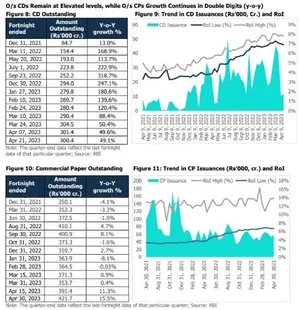 • The Credit to Deposit (CD) ratio has been generally trending upward since the later part of FY22 and reached 75.7% in the fortnight, expanding by ~370 bps y-o-y from April 22, 2022, due to continued faster growth in credit as compared to deposits. The CD ratio has been hovering near the pre-pandemic level of 75.8% in Feb 2020 and 75.7% in March 2020. • If sequential movements of credit and deposit in Rs lakh crore are considered, the above figure presents a slightly different picture, with only the 12-month period showing an increase of credit over deposits, while for other periods, deposit accretion has been higher than credit offtake in absolute numbers. Meanwhile, deposits fell sequentially, while credit grew. • Credit growth generally began picking up in H2FY22 and surpassed deposit growth in Q4FY22, since then it has continued the momentum. A part of the funding gap has been met via Certificates of Deposits (CDs). A wide gap in credit and deposit growth, lower liquidity and strong credit demand has been driving for higher issuance of CDs. Banks are keeping their CD issuance elevated to meet short-term requirements amid lower liquidity and focusing on shoring up the deposits to meet robust credit demand. Fund mobilisation through CDs issuances was strong at Rs 6.7 lakh crore during FY23, higher than Rs 2.3 lakh crore in the previous year. The outstanding CDs stood at Rs 3.0 lakh crores as of April 21, 2023, compared to Rs. 2 lakh crore a year ago.