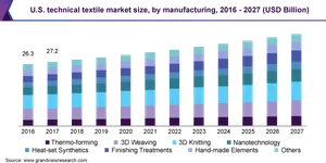 From 2020 to 2027, the market for technical textiles in the United States is projected to grow at a CAGR of 3.8%, reaching USD 39.3 billion. Industry expansion in the automotive, medical, building, agricultural, packaging, and aerospace sectors is predicted to drive market expansion in the nation.