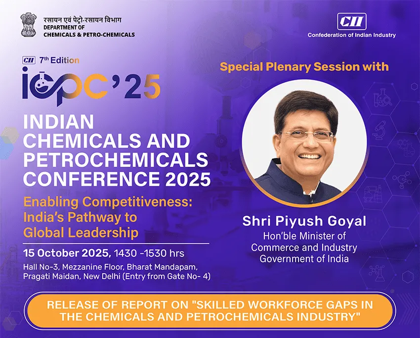 Enabling Competitiveness: India’s Pathway to Global Leadership Wednesday, 15 October 2025, Hall No 3, Bharat Mandapam, New Delhi The Indian Chemical and Petrochemical sector is a cornerstone of the country’s manufacturing ecosystem, supplying essential raw materials to critical industries. The government’s transformative measures towards building an Atmanirbhar Bharat have further integrated the sector into global value chains, positioning it as a potential manufacturing hub for the world. CII is organising the 7th edition of the Indian Chemicals and Petrochemicals Conference (ICPC) on Wednesday, 15 October 2025, New Delhi. The theme for this year’s conference is “Enabling Competitiveness: India’s Pathway to Global Leadership.” Shri Piyush Goyal, Hon’ble Minister of Commerce and Industry, GoI has kindly given his consent to deliver the Keynote Address at the Special Plenary Session of the Conference. I am writing to you with a special request to kindly consider joining us on 15 October 2025 for the 7th edition of the Indian Chemicals and Petrochemicals Conference (ICPC) in New Delhi. Your office may confirm the participation by using the registration link: https://cam.mycii.in/ORNew/Registration.html?EventId=E000071320