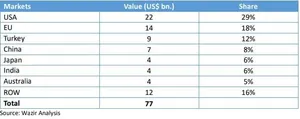 Source: Textile Focus, Floor Covering Weekly, Carpet Research Institute and Wazir Analysis As of 2021, the global rug market comprises 30% of the overall market, valued at US$ 27 billion, with carpets accounting for the remaining 70%, valued at US$ 50 billion2 . The largest segments within the global rug and carpet market are bath rugs and wall-to-wall carpets. The global trade of rugs and carpets have stood at US$ 17 billion in 2021, with tufted category holding the highest share of 43%, followed by woven 32%.3 The synthetic fiber segment dominates the market with 56% share, which is attributed to its economical prices, durability, and low maintenance requirements. The USA is the largest market accounting for US$ 22 billion in 2021 having 29% market share, followed by Europe accounting for US$ 14 billion for the same period having 18% share. The synthetic fiber segment dominates the market with 56% share, which is attributed to its economical prices, durability, and low maintenance requirements Figure 2: Global Market Size (2021)