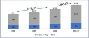 More than 85% of the demand for carpets and rugs in the US is met by domestic manufacturing, with the remaining 20% being fulfilled through imports. According to the Carpet & Rug Institute (CRI), the state of Georgia alone accounts for over 45% of the world's carpet supply. Interestingly, the top four countries that produce carpets are also the top four markets for carpets in the world. India Rugs & Carpets Market Scenario The growth of Indian market of rugs and carpets is steadily accelerating over last 10 years and the trend is expected to continue. Rugs and Carpets market of India stands at US$ 1.2 billion in 2021, growing at a CAGR of 3% since 2011, with rugs having a largest share of US$ 900 million and carpets holding a value of US$ 280 million6. Carpet market is yet to fully develop as majority of households do not use wall to wall carpets. Their usage is concentrated in corporate, hospitality, aviation and entertainment industry. Most of the demand is concentrated in low and economy segment with very low product prices. The demand across segments is growing but India remains a price sensitive market. An important character of Indian market is that almost 80-85% demand is catered to by unorganized, unbranded segment. Figure 3:Indian Market of Rugs & Carpets (US$ Mn)