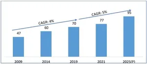 The rug and carpet market is a significant segment of the textile industry, growing at a steady pace fuelled by various factors such as changing consumer preferences, rising disposable incomes, technological advancements, and rapid urbanization. In addition, the use of innovative materials and technology, along with the popularity of e-commerce platforms and online sales channels, are also contributing to the growth of the market. The global rugs and carpet market is valued at US$ 77 billion in 2021 and has been witnessing a growth at a CAGR of 4% over the past decade. The market is expected to reach US$ 95 billion by 2025 at a CAGR of 5% from 2020 to 20251. Global Rugs & Carpets Market Scenario Growth of rugs and carpets sector is highly dependent on the increasing demand for home décor products, recognition of carpet as a necessary product instead of luxury, growth in end-user segments such as hospitality, corporate, retail, entertainment, aviation, etc. Figure 1:Global Rugs & Carpets Market Size (US$ bn.)