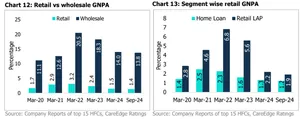 In FY22, the GNPA for the wholesale segment surged to 20.5%, driven by slippages in large project loans, which adversely affected the overall asset quality of HFCs. Since then, the impacted HFCs have focused on recoveries, NPA sell-downs and write-offs in their stressed wholesale book, leading to an improvement in wholesale GNPA to 13.8% as of September 2024.
