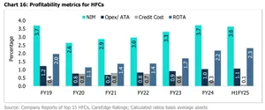 CareEdge Ratings projects YoY credit growth of 12.7% and 13.5% for FY25 and FY26, respectively, for the HFCs. The downside risks to this growth include tighter liquidity, heightened competition, and conscious credit curtailment by HFCs in riskier areas.