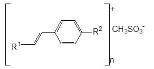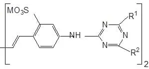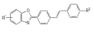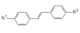 Stilbenes: These group consists mainly of non-ionic compounds, with general formula as shown in (1) with an extended system of conjugated double bonds. They are chiefly suitable for whitening of polyesters, and also polyamides, cellulose acetates and polyvinyl chloride.