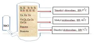 Epoxy group is incorporated into Silicone backbone through hydrosilylation reaction with silyl hydride and allyl glycidyl ether. (Cl)2CH3Si----H + CH2 = CH-CH2-OCH2-CH--CH2 --------Si—(CH2)3—O-CH2 CH---CH2 Amino functional group: Amino group is incorporated into Silicone backbone through hydrosilylation reaction with silyl hydride and allyl chloride and then reaction with ethylene diamine. (OMe)2-CH3--Si-(CH2)3-NH(CH2)2-NH2 MeOH reflux(Cl)2CH3Si----H + CH2 = CH-CH2Cl Si-(CH2)3-Cl NH2-(CH2)2NH2 Basic manufacturing process of Chlorosilane in Fluidised Bed reactor Absolute pure Silicon powder is used in the synthesis of methylchlorosilane in presence of Copper catalysts and promoters mixed to the contact mass. This Silicone powder is manufactured by Silica by charcoal reduction method. This contact mass is then introduced in the Fluidized bed reactor and reacted. Unreacted chloromethane, the gaseous Methylchlorosilanes, gaseous by-products, Catalyst components and finely divided dusts leave the Reactor. SiO2 + C------------Si + CO2 Si + CH3Cl Cu Catalyst ------- (CH3)2SiCl2 + CH3SiCl3 + (CH3)3SiCl + SiCl4