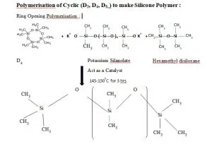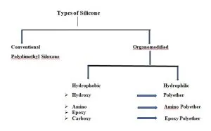Ring opening polymerization occurs through addition polymerisation in three different stages. Stage 1 : Initiation In this stage Potassium Silanolate catalyst opens the cyclic ring of D4 and generates initiator. Stage 2 : Propagation In this stage Initiator reacts no of moles of Cyclic D4 and propagate the chain and molecular weight increases. Stage 3 : Termination In this stage terminal (O-) of propagating chain of both the sides react with hexamethyl disiloxane, chain terminator and stops the polymerization and desired molecular weight is obtained. Classification of Silicones Silicones are classified into two broad category. One is Inorganic Silicone and the second one is Organic Silicone. Inorganic Silicone : Inorganic Silicone is a highly active adsorption material usually a reaction with Sodium Silicate and Sulphuric acid and aging and its chemical formula is mSiO2, nH2O. It is insoluble in water and any solvent, non toxic, tasteless, chemically stable, in addition to alkali it does not react with hydrofluoric acid also. It has high adsorption property, excellent thermal stability and very high mechanical strength. It is used in various Industries, such as the common colorful kids slap watches are made of Inorganic Silica. Organic Silicone : Organic Silicone is an organic Silicone compound refers to those containing a Si-C bond, and at least one organic group is directly connected to Silicone atom in the compound, it is customery also oftenes to the organic group and the Silicone through Oxygen, Sulfur, Nitrogen, etc atoms connected to the compound is also used as Organic Silicone compound. Wherein the Silicone Oxygen bond ( –Si---O-----Si--) as backbone consisting of a Polysiloxane which is more than 90% of the total amount of organic Silicone compound. It is used in various Industries including Textile, Fiber Finish, Personal care, Health Care, Rubber both high temperature vulcanization (HTV) and Room temperature vulcanization (RTV), Automobile, Eletronic, Space research and so on. This article will exclusively focus only on Textile and fiber finish segment. Types of Organic Silicone Organic Silicones are broadly two types. One is Conventional Silicone and the second one is Organomodified Silicone. Classic example of Conventional Silicone is Polydimethy Silicone. Depending on the functional group present, Organomodified Silicone is further classified into two type. One is Hydrophobic and the other is Hydrophilic. Hydrophobic Silicone includes Hydroxy, Amino, Epoxy and Carboxy group. Hydrophilic Silicone includes Polyether, Amino Polyether and Epoxy Polyether.