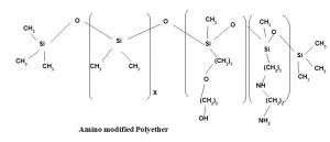 Application area 7: Hydrophilic finish with very good softness It is a Polyether based terpolymer of amino silicone having Polydimethyl Siloxane in other block. It imparts both hydrophilicity and softness. As the polyether content increases hydrophilicity increases but at the same time softness decreases. Similarly with increase of amine value softness increases but yellowness also increases and shade variation is also noticed. To get the optimum result amine value and polyether content has to be balanced. For Amino Silicone based textile softener amine value is generally maintained 8 to 30. For certain special cases amine value is maintained 40 but it is very rare.