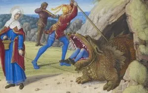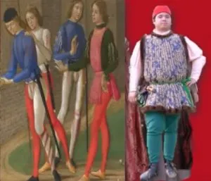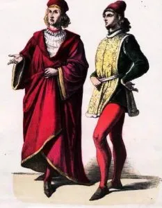 Over the shirt, men were wearing doublet, which were fastened with buttons or closing from the front. Length of doublet could be very short (to the waist level), or could cover the hips. As a rule, sleeves were fixed to the sleeve cap with little fasteners or wide ribbons. As a result, a man had freedom of movements and variety of clothing, as he could attach different sleeves to the one doublet Hoses: On the leg, italian chevaliers were wearing tight pants - hosessewn of the resilient fabrics, which did not hinder the movements. In the XV century, some innovation in men’s fashion has appeared. There was a codpiece, which combined two parts of pants and was attached with lacing or small buttons. For long time, men were wearing multi-coloured hoses, for example, one pant leg was sewn of unicolour fabric, and the second one - of strips of different colours. Men began to wear short puffed hautde-chausses over the fitting stocking only in the end of the XV century. Coats: