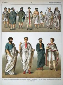 Through the course of Roman history, from the early years of ancient Rome in 753 B.C.E. to the fall of the Roman Empire in 476 C.E., there were two garments that were essential to the male wardrobe: the tunica and the toga. Adapted from the Greek chiton, the tunica, a type of shirt, was the simplest of garments. It was made from two rectangular pieces of fabric, one set on top of the other. It was sewn together at the sides and the top, with holes left for the head and the arms. Tunica’s could also have sleeves, ranging from very short in the early republic to full length later in the empire. Only Romans were allowed to wear Toga (not the slaves, and not the free men, who were slaves before) Social Classes and Costumes