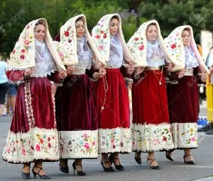 Women wear dresses, with long skirt of at least 4 or 5 meters fabric, generally green or black. White embroidered shirt Often Red socks Tablier or Apron: