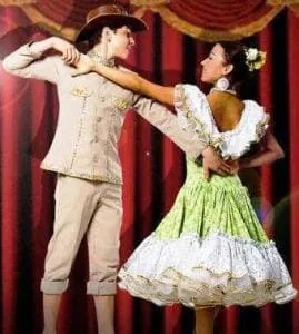 The Wayuushe’ or Wayuu Blanket is the handcrafted traditional dress of the Wayuu women that can be made with cotton, silk or terlenka. The typical Wayuushe’ is square or rectangular; its neck may be a square ‘V’ or an oval. In the front, there is a string that anchors the blanket or ‘manta’ at the waist; the string is knotted at the back of the dress. Clothing and Costumes of Colombia: Every region of Colombia is having different climate and culture and so are the dressing of the people. It varies right from amount of fabric used to the different accessories and adornments used. The traditional Huila dress is worn during the Sanjuanero dance. Women wear a ruffled white blouse that hangs off the shoulders, adorned with lace and sequin. A wide skirt opened during dance is made from colorful satin and lace, often with colorful floral decorations along with colorful flowers in her hair. The men’s dress is with simple white shirt and trousers, a red scarf, leather belt and a hand-made hat.