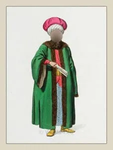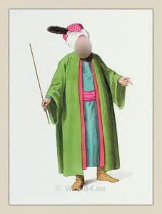 The sarouel and cassok were both decorated by a piece of tissue as a pocket or a belt, called "kusak" pronounced "kouchak"). We can note that at the time, each social class was wearing a different costume according to that if one is close to the Sultan, basic citizen, peasant or scholar.