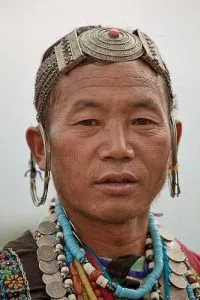 Women's Clothing Women get a tattoo made which consists of blue stripes which are broad in shape and extend from head to the nose tip with five lined drawn vertically under the lower lip on the chin. The hair is neatly arranged on the top of the head into what is known as Dilling. Ading Akh which is nothing but a brass skewer is passed right across the Dilling horizontally. Men's Clothing Traditionally, Aptani men make a knot of their hair on top of their forehead. This hairstyle is known as Piiding. A brass rod is used for creating the knot which is known as Piiding Khotu. Tattoos or Tiippe are applied by men on their chins. Accessories