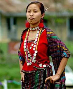 This tribe wears costumes on similar lines to Burmese. The men wear green coloured wrap around spun in white, red as well as yellow coloured yarn. A sleeveless shirt along with an upper garment too is worn. Women's Clothing