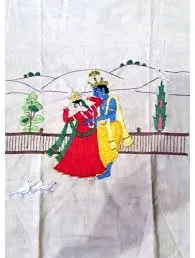 Embroidery is done using a double Satin stitch called Dorukha. Stem stitch is used to draw the outlines and Gujjar women used darning, herringbone, and sometimes satin stitch. Chamba embroidery is inspired by immortal classics like Mahabharat, Ramayan, themes from Indian mythology, a game of chaupad, hunting and marriage scenes, and even the episodes from Raasleela of Radha and Krishna. Sometimes the embroidery also consists of floral and geometrical designs and the border designs are generally floral. The motive used are
