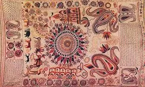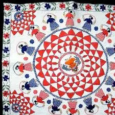 There are two categories of Kantha embroidery - in the first type, cotton saris or dhotis are piled up on top of each other, quilted, and embroidered. The other type used discarded cotton bedspreads and pictorial embroidery was done with the Tussar Silk threads. Motifs used for this embroidery include Lotus, Solar, Moon, Wheel, Swastik, Kalka, Tree Of Life. Kantha embroidery is done on the old fabrics and the threads used for embroidery are drawn from the colorful borders of the discarded saris main the white, red, green, yellow, blue, and black in color. The stitches used in Kantha embroidery are satin, loop, running, and darning stitch. Phulkari (Punjab)