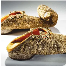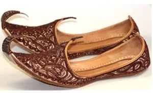 Charhvan Salim Shahi Both men and women wore decorated shoes with turned-up toes (Jhuti), a Persian fashion. Other shoes included the Charhvan, which had a curled tongue attached to the toe, the Salim Shahi, which was ornamented in gold, and the Khurd Nau, which was made of child leather and was very light. They were all worn by nobles and monarchs. During the Mughal era, Lucknow was most well-known for its footwear, and the technique of Aughi, which involves embroidering leather and velvet shoes, was particularly well-liked.[1] Jewellery