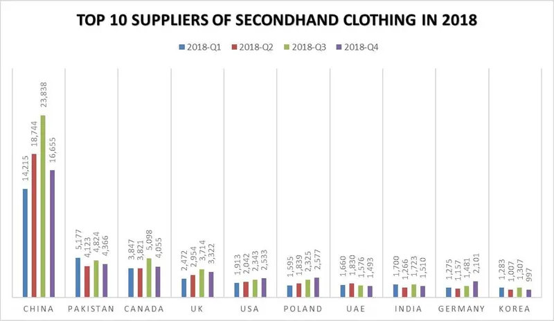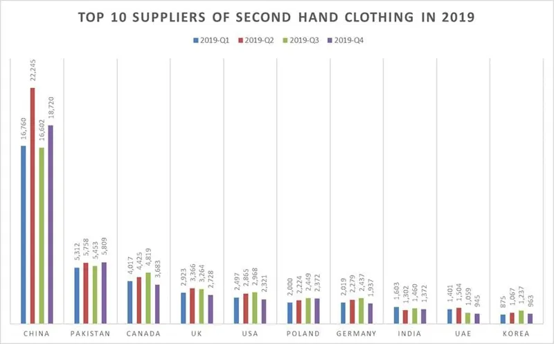In 2019, Kenya imported 185,000 tons of used clothes, which equates to around 8,000 containers. The total amount of taxes collected was 12 billion shillings. The secondhand clothing industry generates at least 1 billion shillings in monthly sales. Traders must also pay business license fees, as well as other taxes to the federal and state governments. Just like every year, China was the leading supplier in 2019 as well. Its highest supply was in the second quarter. China’s Supply summed up to 74,327 tons for the whole year. Pakistan was the second largest supplier with 22,332 tons of supply of secondhand clothing to Kenya. Canada’s supply was worth 16,943 which kept swelling up consecutively till the third quarter and then a substantial reduction was seen in the supply of fourth quarter. India was 8th in this list with the total supply of 5,737 tons.