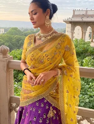 Pair a dark purple blouse with a bright and dark mustard bottom or a pastel purple blouse with light mustard bottoms. The animal print scarf also does justice to this look. Add nude or white shade heels and a pair of cat-eye sunglasses to complete the look. The Purple and mustard combination also works well for an elegant ethnic look.