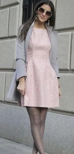Opt for a pink skirt and pair it up with a gray-toned blouse. You could also consider wearing a gray pullover over dark blue denim. Complete this outfit with a light pink jacket and Fuschia colored pumps and a black handbag to enhance the look.