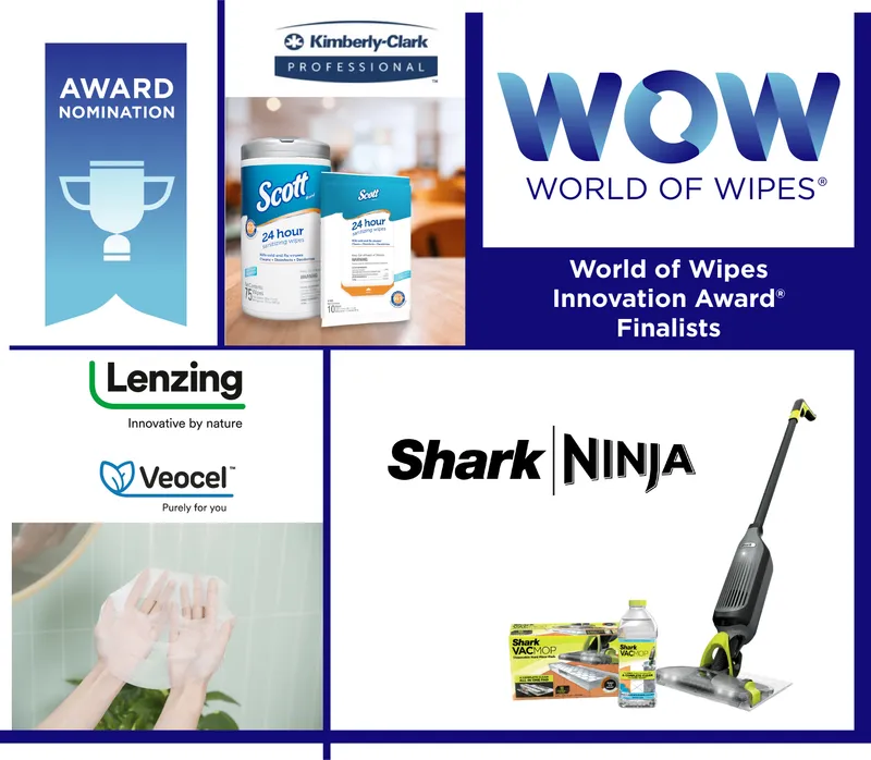 Cary, NC, May 5, 2021 – Nonwoven-based wipe products for sanitizing, cleaning and beauty applications from Kimberly-Clark Professional, Lenzing, and SharkNinja are the finalists vying for this year’s prestigious World of Wipes Innovation Award® that will be selected at the 15th edition of the 2021 World of Wipes® (WOW) International Conference, July 12-15, in Atlanta, Georgia.