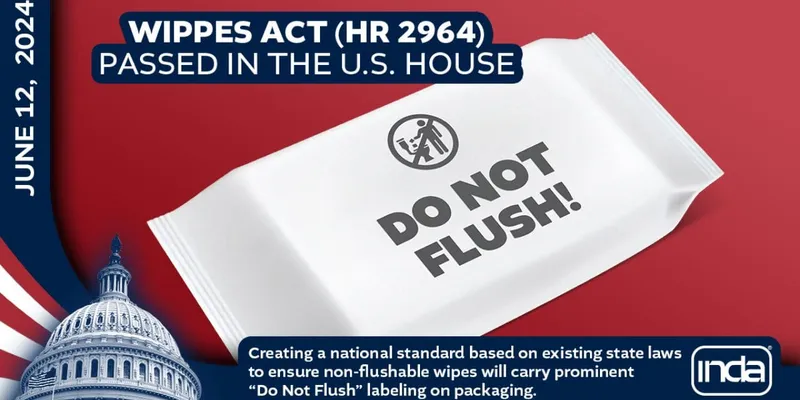 INDA, the Association of the Nonwoven Fabrics Industry, applauds the U.S. House of Representatives for passing the Wastewater Infrastructure Pollution Prevention and Environments Safety (WIPPES) Act (H.R. 2964). The WIPPES Act, which creates national standards for “Do Not Flush” labeling for non-flushable wipes, passed out of the House Committee on Energy and Commerce in December of 2023, and today it cleared the House floor in a bipartisan vote. The bill now awaits consideration in the Senate Science, Commerce, and Energy Committee.